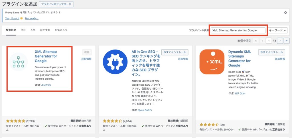 「XML Sitemap Generator for Google」と検索して、今すぐインストールをクリックします。