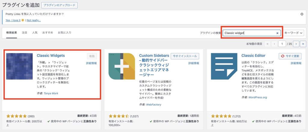 こちらのプラグインでは、以降でサイドバーの編集を実施する際に導入しておいてほしいプラグインです。まずはプラグインの導入と有効化をお願いします。